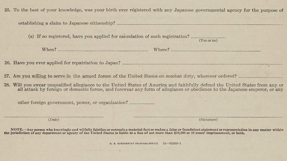 28. Will you swear unqualified allegiance to the United States of America and faithfully defend the United States from any or all attack by foreign or domestic forces, and forswear any form of allegiance or obedience to the Japanese emperor, or any other foreign government, power, or organization?