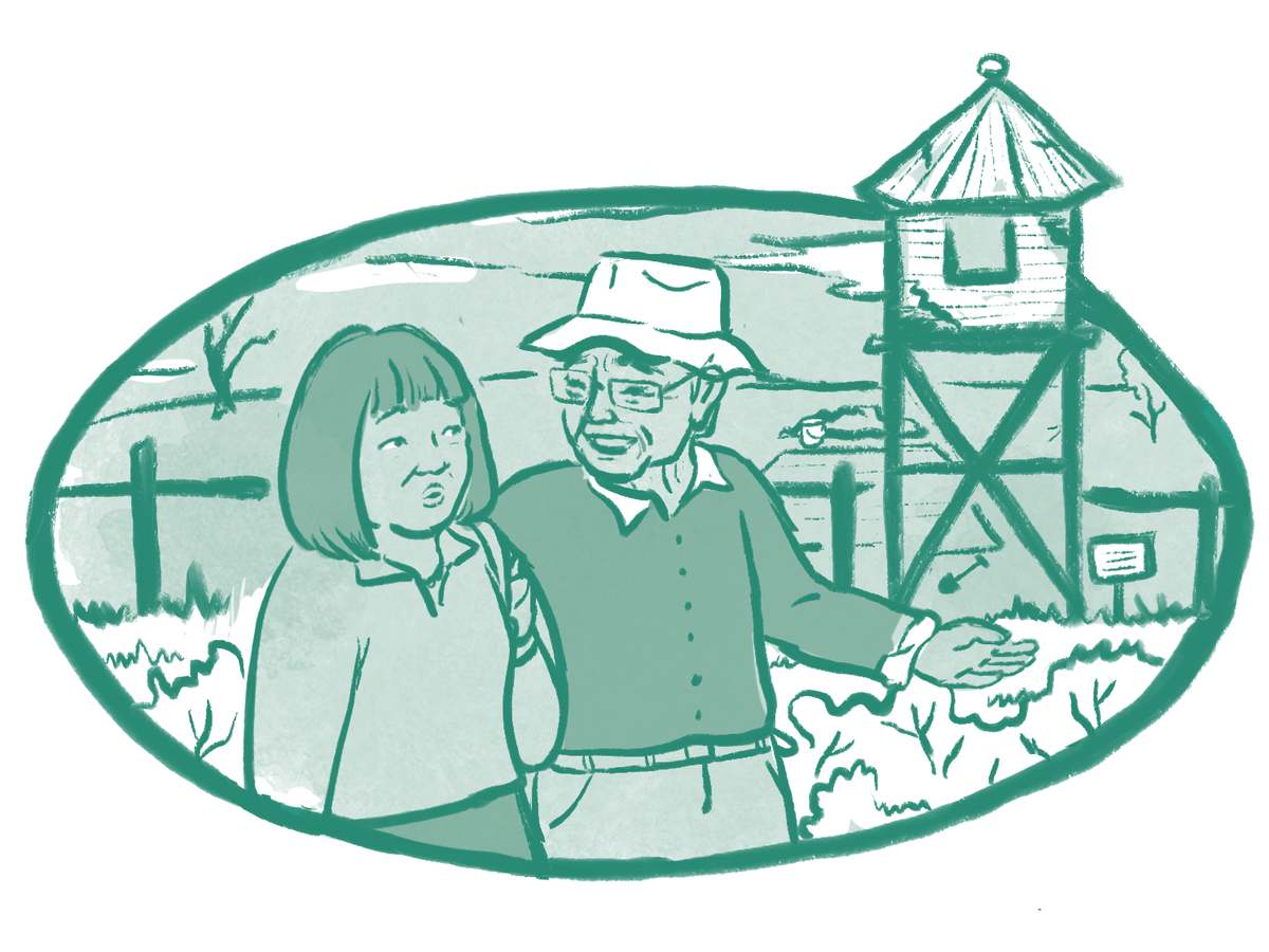 Ahead of her, Grandpa Min trekked through the brush. He had so many stories about being a teenager in this place, which was the site of the Amache concentration camp he’d spent several years at during World War II. He pointed out the train depot where his family was dropped off after riding for a full day in complete darkness. He told her about the guard towers that used to surveille the premises. When they walked into a recreated barrack, he remarked that it was “too nice” compared to the conditions he remembered. His barrack didn’t have a brick flooring, only dirt. Instead of tight, uniform planks, the planks in his barrack had large cracks in between them that let in dust and heat.